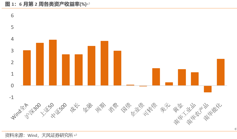 6月第2周,A股持续反弹,Wind全A收涨3.01%,周期股、金融股、消费股和成长股分别上涨3.81%、3.38%、2.98%和2.68%。大盘股和中盘股均出现录得涨幅,大盘股(上证50和沪深300)、中盘股(中证500)分别上涨3.92%、3.65%和2.66%(见图1)。