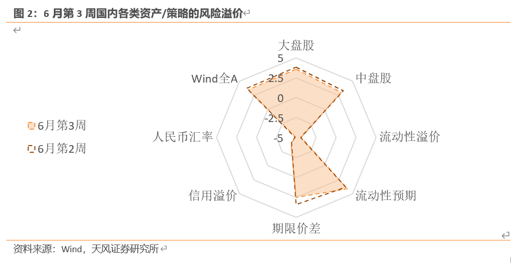6月第2周,央行公开市场操作投放与回笼资金数量相等,资金面保持平稳,流动性溢价维持在低位(6%分位),持续处于【极宽松】水平,但是中长期流动性预期持续抬升(91%分位),已经来到历史较高位置,市场对未来流动性收紧的预期较强。两者存在显著矛盾,在人民币汇率贬值、通胀超预期上升的环境下,短端利率存在脆弱性,需要关注类似16年10-12月和20年5-6月流动性溢价快速上升的风险。