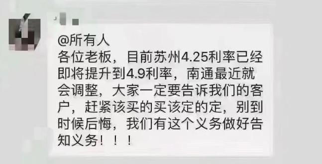 近日,网上有聊天截图显示,苏州4.25%的房贷利率即将提升到4.9%,南通市最近也会调整。该截图提醒,“赶紧该买的买该定的定,别到时候后悔,我们有这个义务做好告知!”