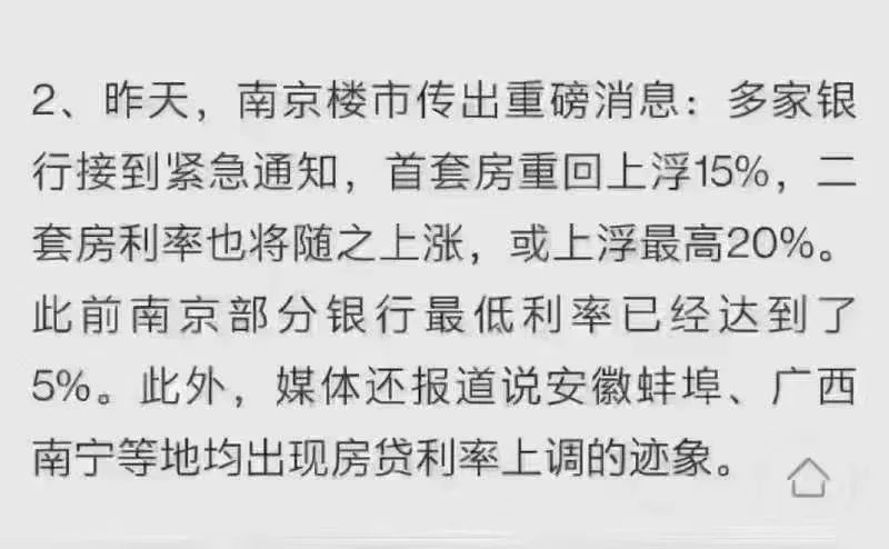 此外,有网友称,济南房贷利率已经上调到4.4%,青岛、徐州上调到4.9%。另一则传言则称,徐州的房贷利率从4.25%上涨到了4.6%。同样,近期楼市政策不断的南京,也传出利率上调的消息,传闻称,多家银行将首套房贷款利率上浮15%,二手房贷款利率或上浮20%。