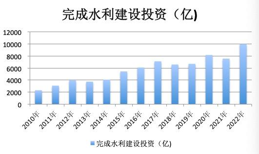Wind数据显示,2010年全国完成水利投资2320亿,2014年增长至4083亿,2020年超过8000亿。不过2021年出现小幅下滑,当年完成水利投资7576亿。