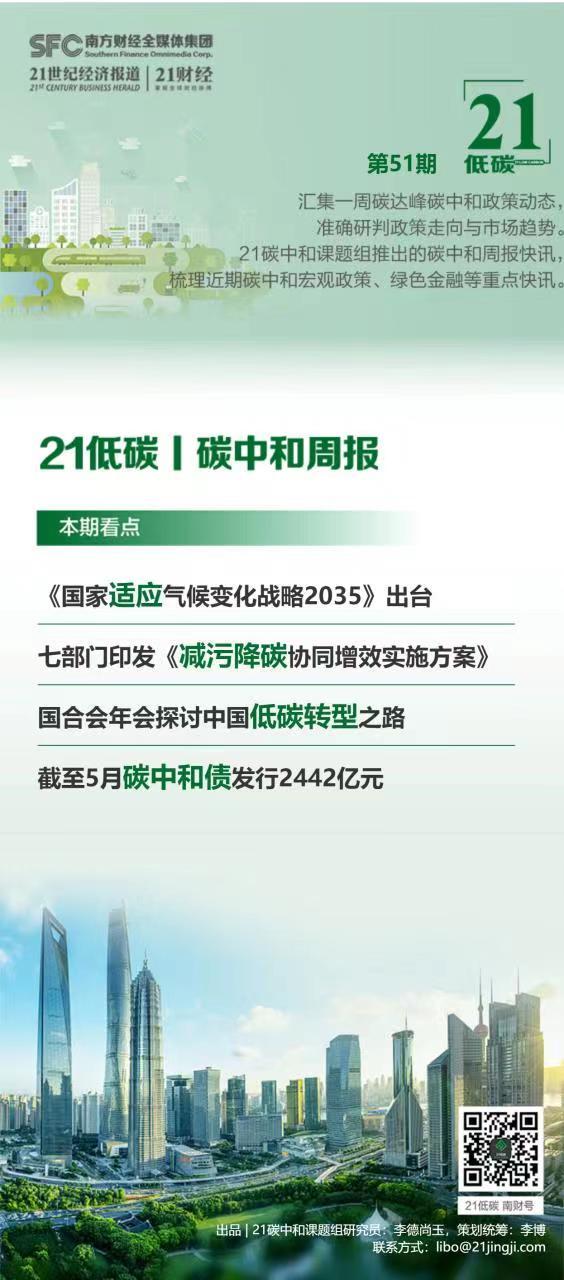 本期看点:《国家适应气候变化战略2035》出台,构建气候适应型社会;七部门联合印发《减污降碳协同增效实施方案》;国合会年会探讨多重挑战下的中国低碳转型之路;截至5月碳中和债发行2442亿元,促进碳减排4203万吨。