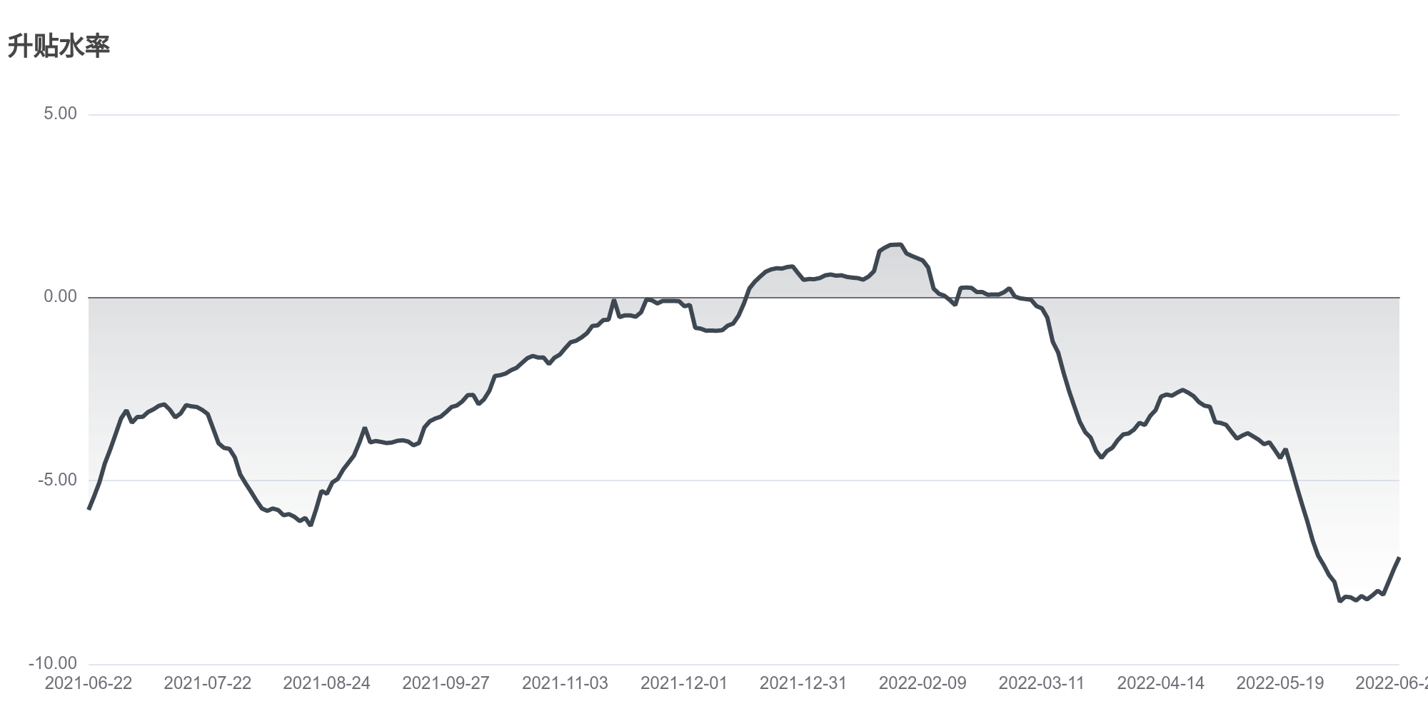 今日该指标值为-7.08%,目前该指标处于近一年较低区间,说明投资者对认为A股市场趋于触底反弹。反映期货市场投资者对市场的看法,该指标越高说明投资者认为当前市场较强,越低则说明认为市场相对较弱,因而与上证指数正相关。