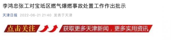 据天津日报报道,6月21日16时45分许,宝坻区北城东路与吴苏路交口附近发生燃气爆燃事故。获悉情况后,市委书记李鸿忠,市委副书记、代市长张工迅即作出批示,要求市卫生健康委和宝坻区委立即全力组织抢救伤员,市应急局等部门会同宝坻区认真核查事故原因,防止出现后续关联事故。同时,要坚持举一反三、深入开展隐患排查,坚决杜绝类似事故发生。