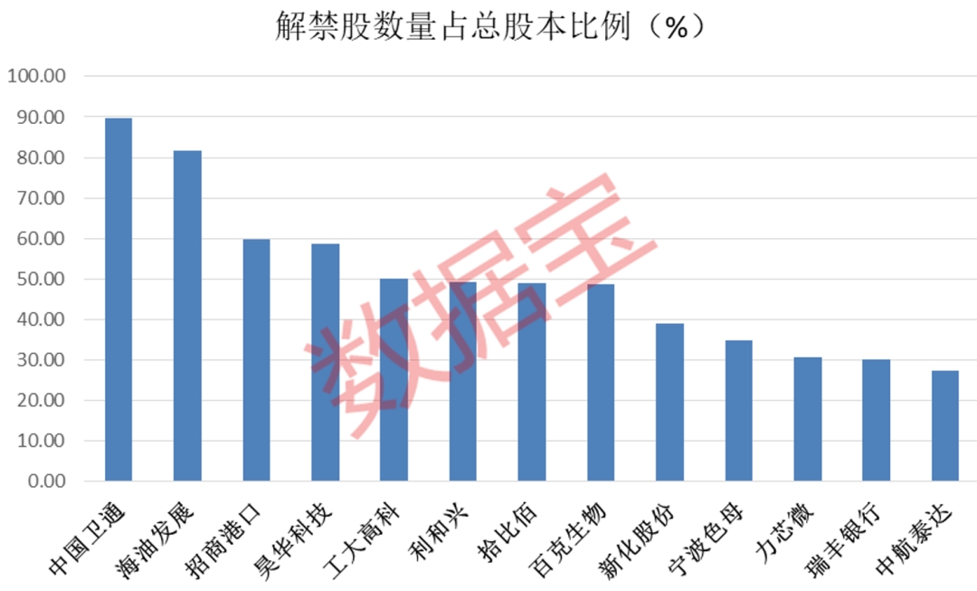 从解禁股数量占总股本的比例来看,5股解禁比例超50%,中国卫通的解禁比例最大,达到89.81%。海油发展、招商港口、昊华科技的解禁比例居前。