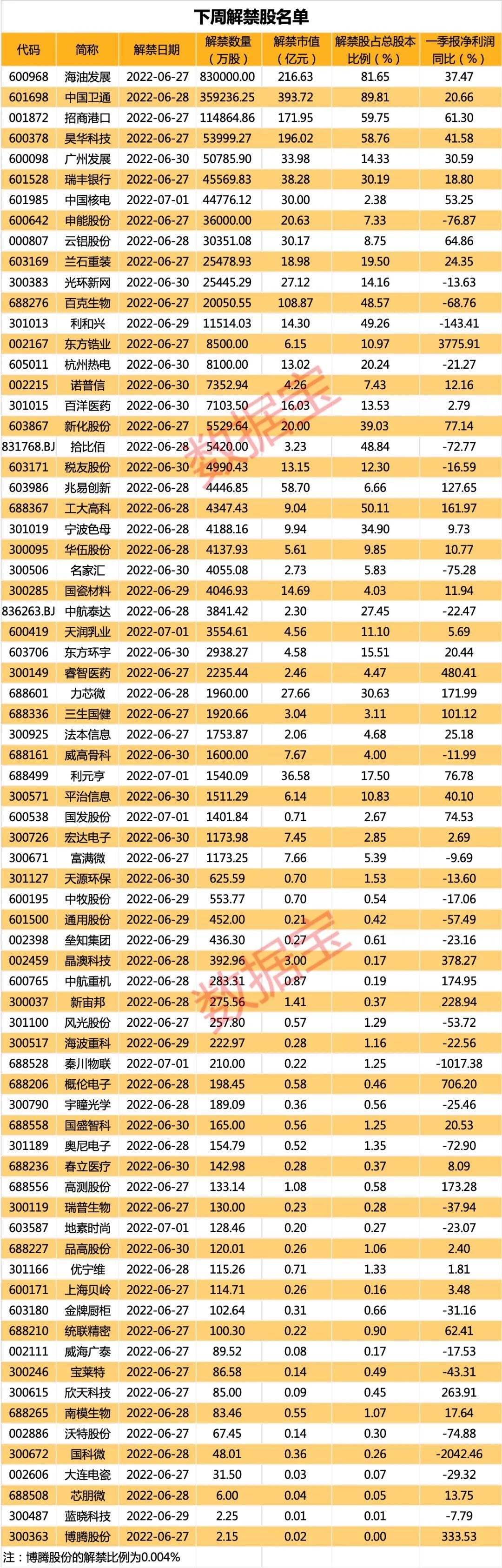 5股解禁市值超百亿元。中国卫通的解禁市值最大,下周将有35.92亿股上市流通,主要是首发原股东限售股份,解禁市值达393.72亿元。海油发展、昊华科技、招商港口、百克生物的解禁市值均超百亿元。