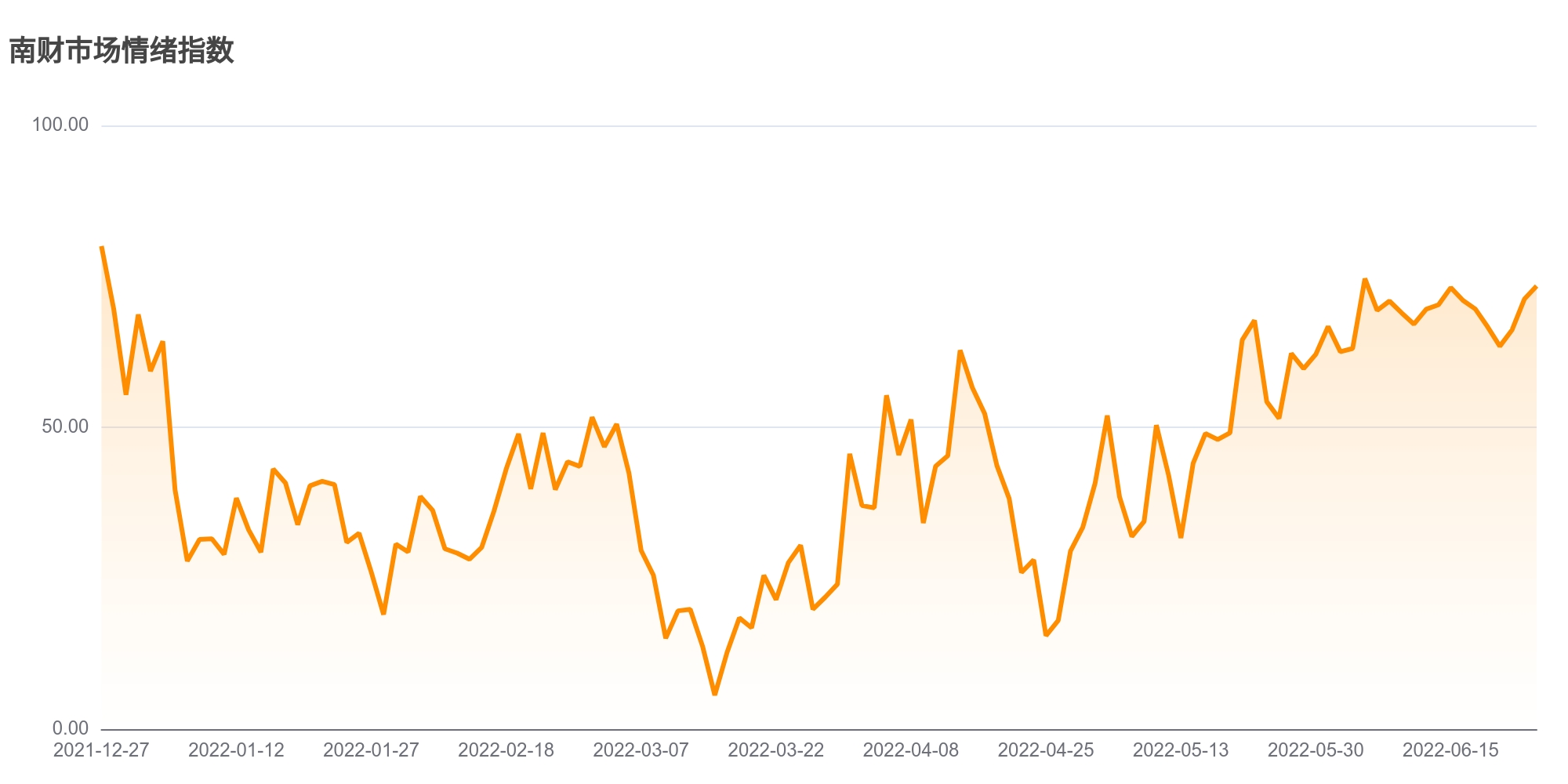 今日南财市场情绪指数为73.4,较前日71.2上涨,市场投资热度提升。A股市场的行为是非常情绪化的,当市场上涨时,投资者趋于贪婪,产生追涨情绪;当市场下跌时,往往会失去理智急于出售他们的资产。为量化投资者当前对购买股票的情绪程度,基于中国波指(iVIX)与CNN恐慌贪婪指数,南财量化团队挑选出五大指标,综合加权得到了南财情绪指数。南财情绪指数范围从0-100,越低表明市场投资热度较低,越高表明市场投资热度较高。南财情绪指数有助于市场参与者更好地认识和分析股票市场的波动风险和跳跃风险,市场投资热度偏低表明投资者过于担心,如果当前市场定价并不高,这可能是一个买入机会。市场投资热度偏高则表明投资者过于兴奋,如果市场处于高位,市场可能会进行调整。南财情绪指数的发布,不仅有利于投资者进行更佳的风险管理,也为维持金融市场的稳定繁荣提供了有效的参考依据。