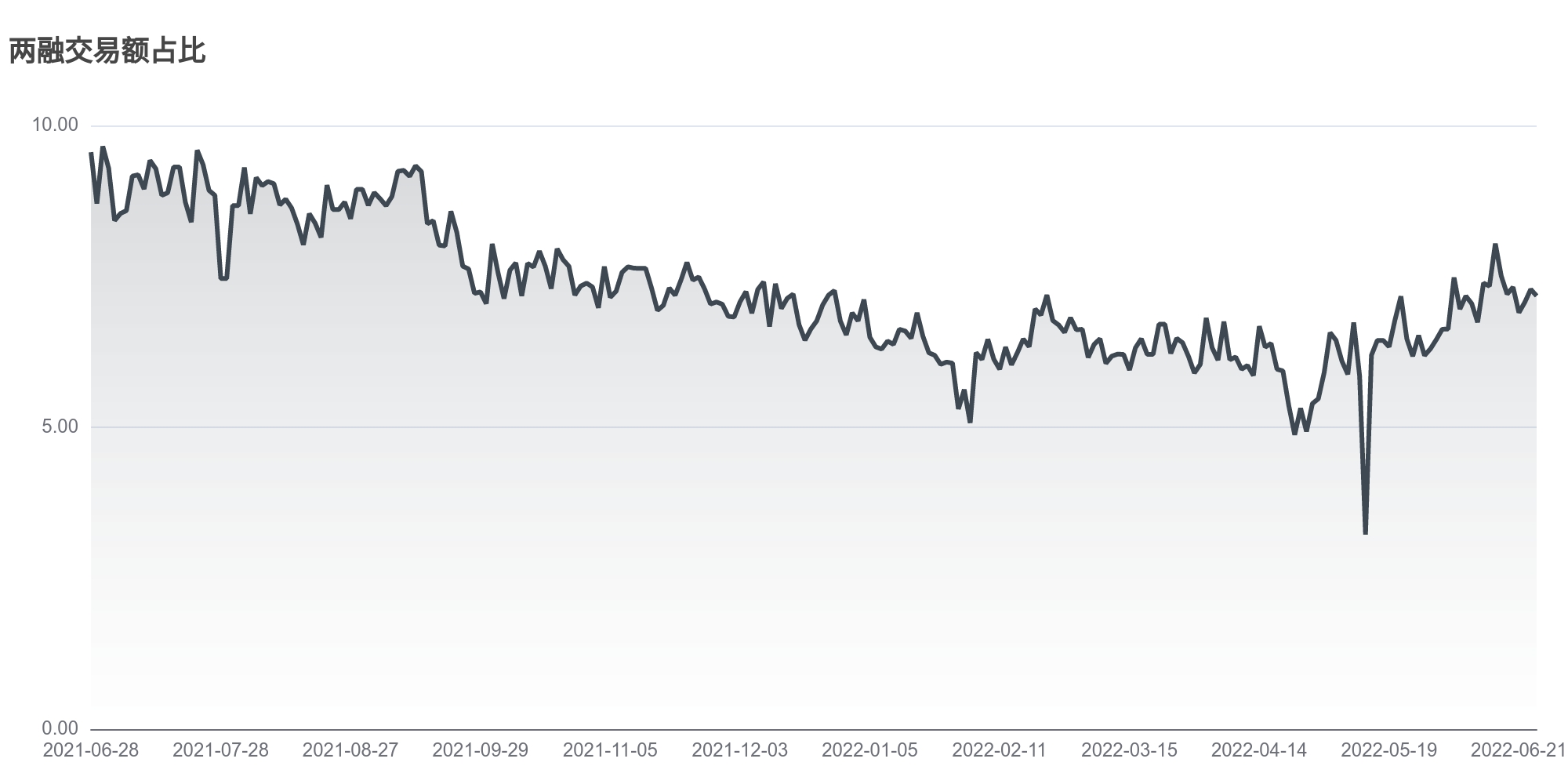 今日该指标值为7.18%,目前该指标处于近一年中立区间,说明投资者对A股持中立情绪。反映场内投资者借钱炒股的杠杆水平,该指标越高说明杠杆水平越高,即投资者认为当前市场较强,反之则说明投资者认为市场相对较弱,因而与上证指数存在较强的正相关性。