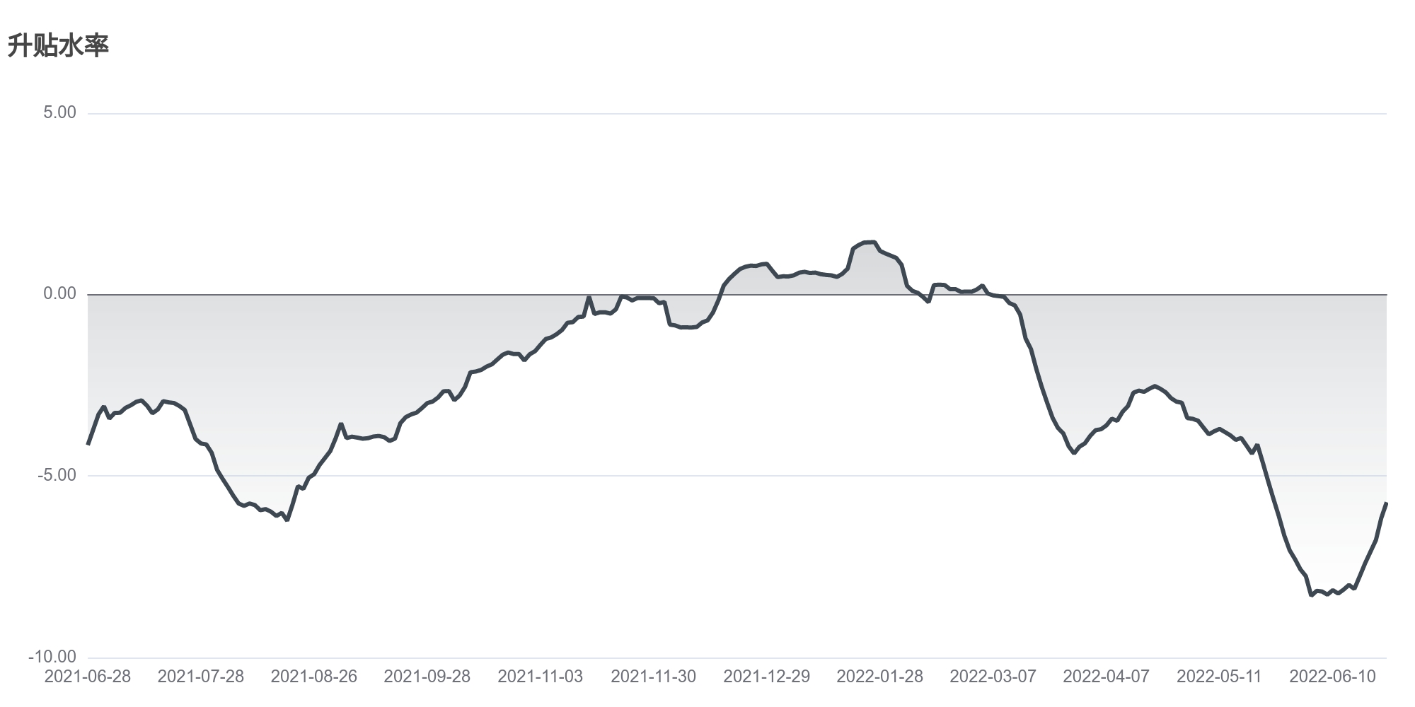今日该指标值为-5.72%,目前该指标处于近一年较低区间,说明投资者对认为A股市场趋于触底反弹。反映期货市场投资者对市场的看法,该指标越高说明投资者认为当前市场较强,越低则说明认为市场相对较弱,因而与上证指数正相关。