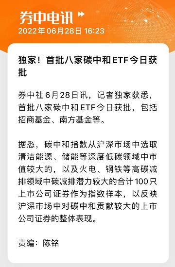 证券时报·券中社记者独家获悉,首批八家碳中和ETF今日获批,包括招商基金、南方基金等。