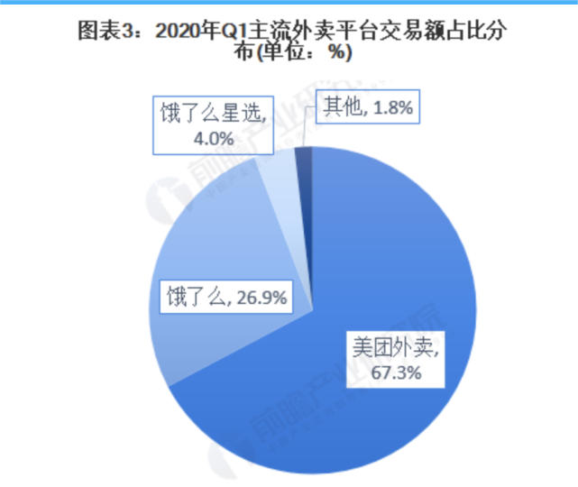 长久以来,外卖市场由美团和饿了么两家瓜分,形成“双寡头”的格局。2020年第一季度主要外卖平台市场格局,美团外卖、饿了么、饿了么星选三大平台占据了92%的市场份额,尤以美团最为突出,占比将近七成,具有绝对优势。