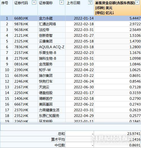 Wind数据统计结果显示,年初至今,港股总计上市26只新股,首发募资合计23.97亿美元,其中募资规模最大公司为金力永磁(约5.44亿美元),其中18家公司募资金额在2亿美元以下。