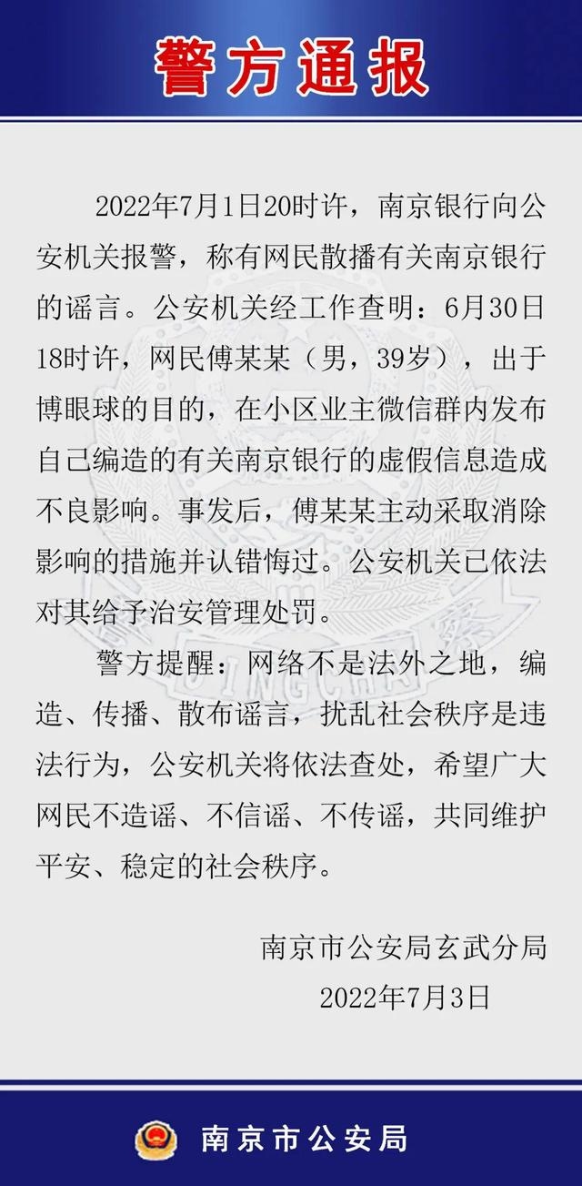 7月3日,据“南京警方”微信公众号消息,南京市公安局玄武分局发布警方通报称,2022年7月1日20时许,南京银行向公安机关报警,称有网民散播有关南京银行的谣言。公安机关经工作查明:6月30日18时许,网民傅某某(男,39岁),出于博眼球的目的,在小区业主微信群内发布自己编造的有关南京银行的虚假信息造成不良影响。事发后,傅某某主动采取消除影响的措施并认错悔过。公安机关已依法对其给予治安管理处罚。