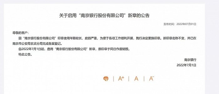 此外7月1日,南京银行还在官网发布启动新章的公告,目前该公告已不可见。公告称,因“南京银行股份有限公司”印章使用年限较长、磨损严重,为便于各项工作顺利开展,我行决定更换印章。新印章名称不变,并已在南京市公安局玄武分局完成备案登记。自2022年7月1日起,启用“南京银行股份有限公司”新章,原印章于同日作废销毁。