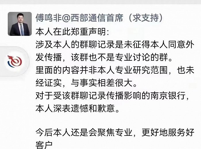 原来当日午间,一则涉及南京银行的群聊记录在社交媒体快速发酵,交流内容为西部证券通信首席傅鸣非关于南京银行的一些判断与风险提示。
