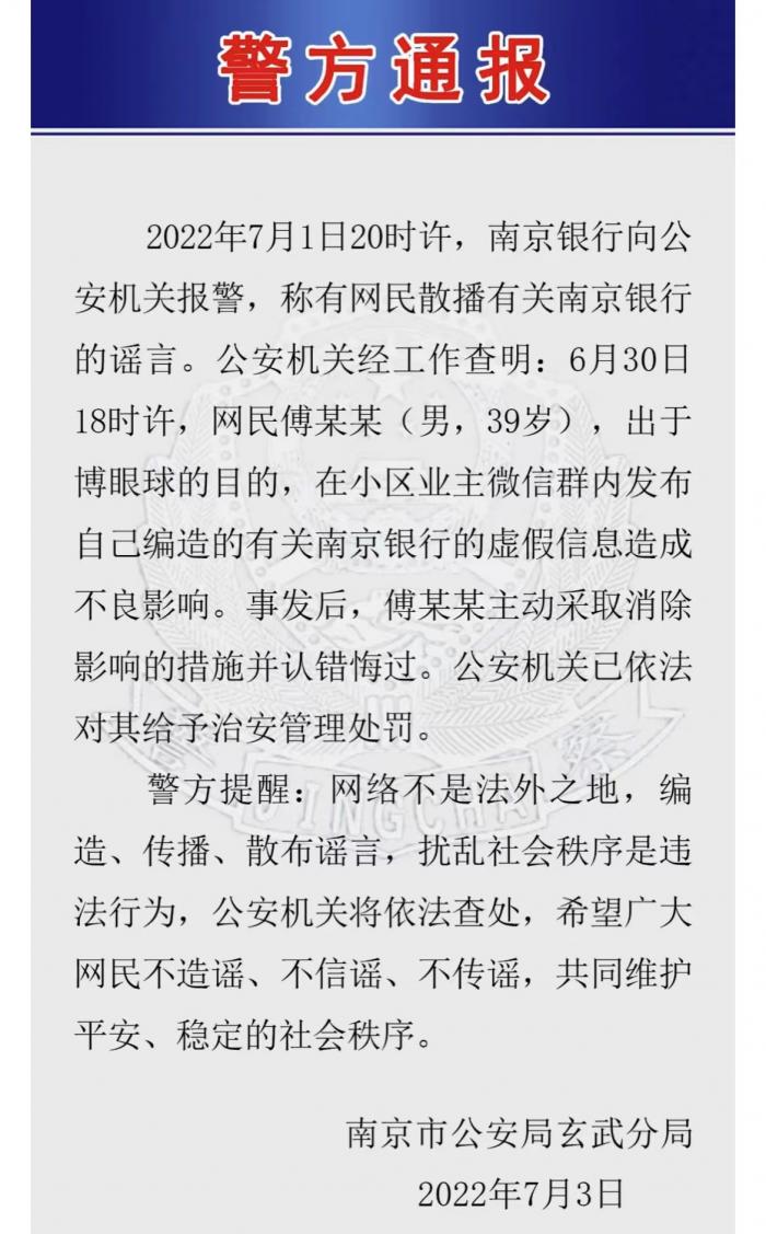 7月3日,@平安南京 发布警方通报称,2022年7月1日20时许,南京银行向公安机关报警,称有网民散播有关南京银行的谣言。公安机关经工作查明:6月30日18时许,网民傅某某(男,39岁),出于博眼球的目的,在小区业主微信群内发布自己编造的有关南京银行的虚假信息造成不良影响。事发后,傅某某主动采取消除影响的措施并认错悔过。公安机关已依法对其给予治安管理处罚。