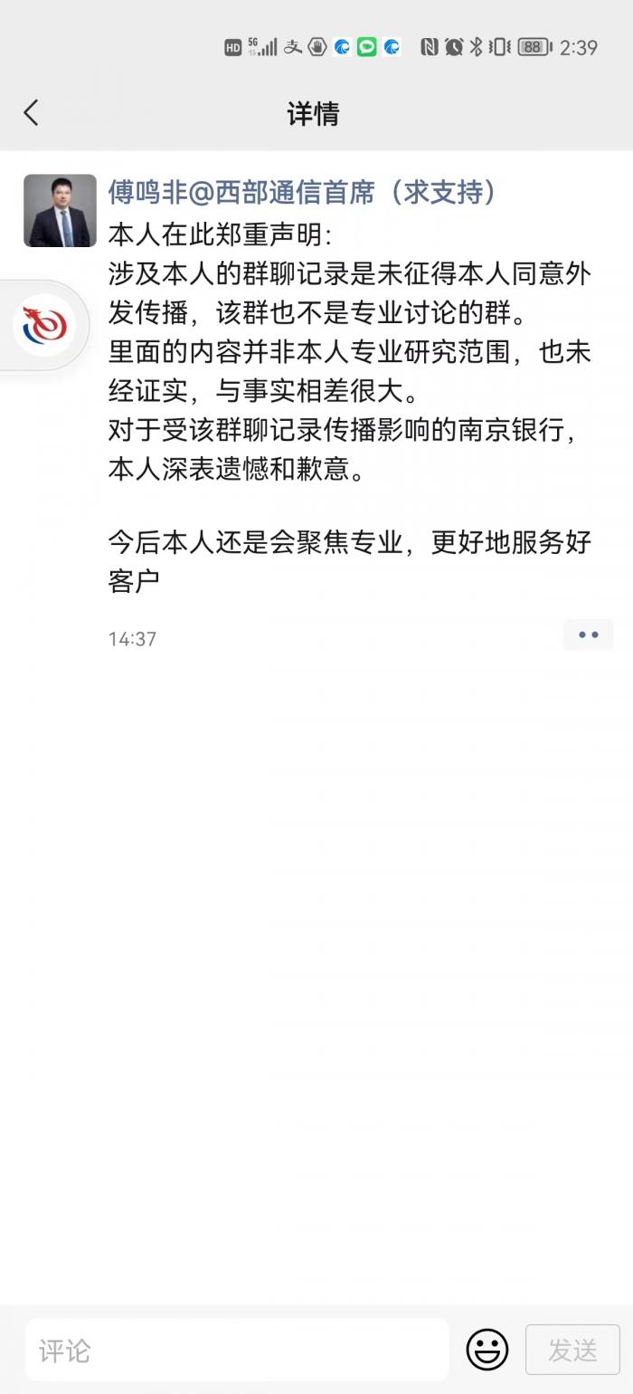 不过在群聊传出之后,傅即发布朋友圈称,相关群聊是未征得本人同意外发传播,该群不是专业讨论的群,里面的内容并非本人研究范围,也未经证实,与事实相差很大。傅还在朋友圈对南京银行致歉。
