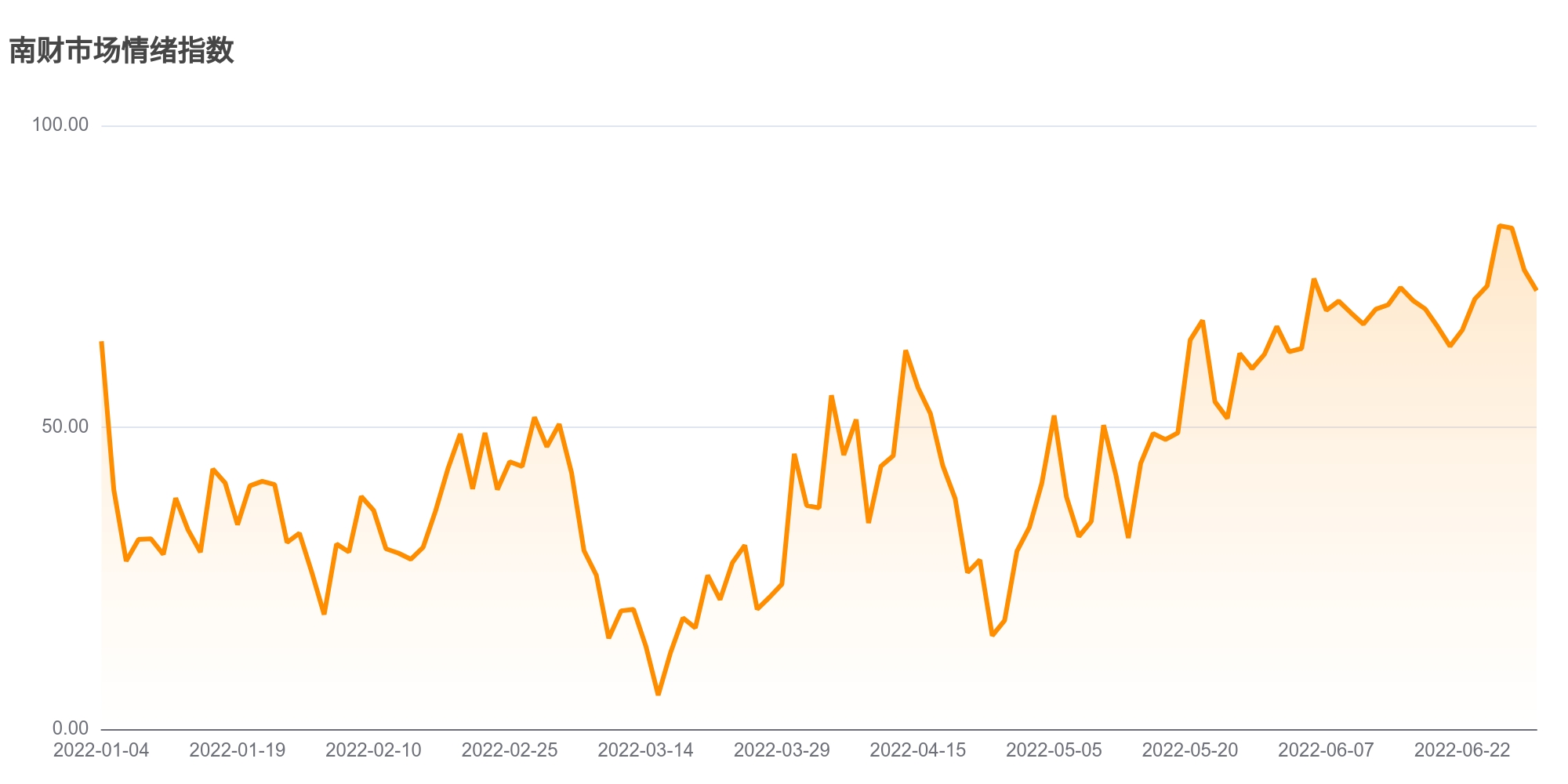 今日南财市场情绪指数为72.6,较前日76.1下跌,市场投资热度降低。A股市场的行为是非常情绪化的,当市场上涨时,投资者趋于贪婪,产生追涨情绪;当市场下跌时,往往会失去理智急于出售他们的资产。为量化投资者当前对购买股票的情绪程度,基于中国波指(iVIX)与CNN恐慌贪婪指数,南财量化团队挑选出五大指标,综合加权得到了南财情绪指数。南财情绪指数范围从0-100,越低表明市场投资热度较低,越高表明市场投资热度较高。南财情绪指数有助于市场参与者更好地认识和分析股票市场的波动风险和跳跃风险,市场投资热度偏低表明投资者过于担心,如果当前市场定价并不高,这可能是一个买入机会。市场投资热度偏高则表明投资者过于兴奋,如果市场处于高位,市场可能会进行调整。南财情绪指数的发布,不仅有利于投资者进行更佳的风险管理,也为维持金融市场的稳定繁荣提供了有效的参考依据。