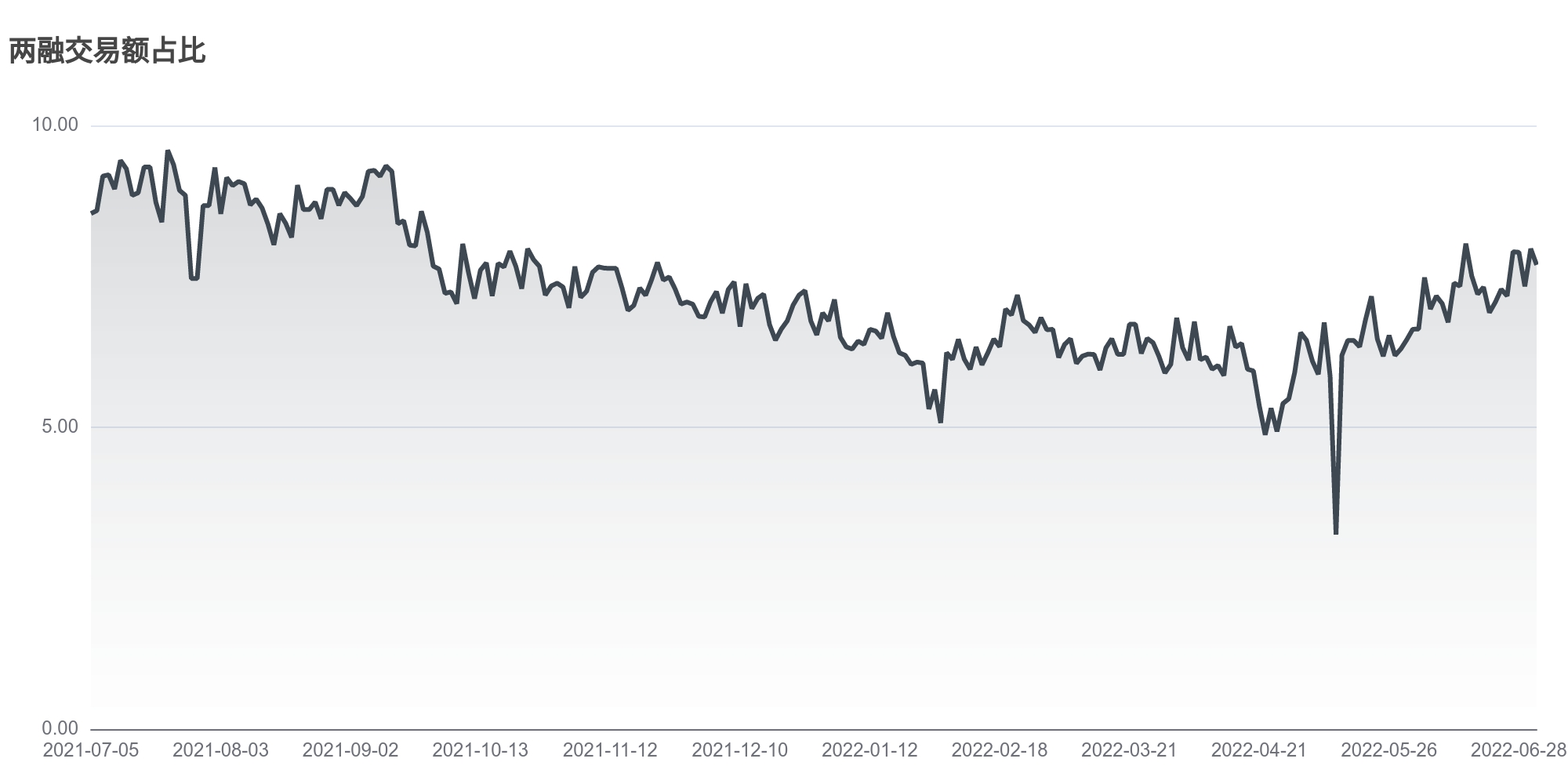 今日该指标值为7.69%,目前该指标处于近一年较高区间,认为当前A股市场相对较强。反映场内投资者借钱炒股的杠杆水平,该指标越高说明杠杆水平越高,即投资者认为当前市场较强,反之则说明投资者认为市场相对较弱,因而与上证指数存在较强的正相关性。