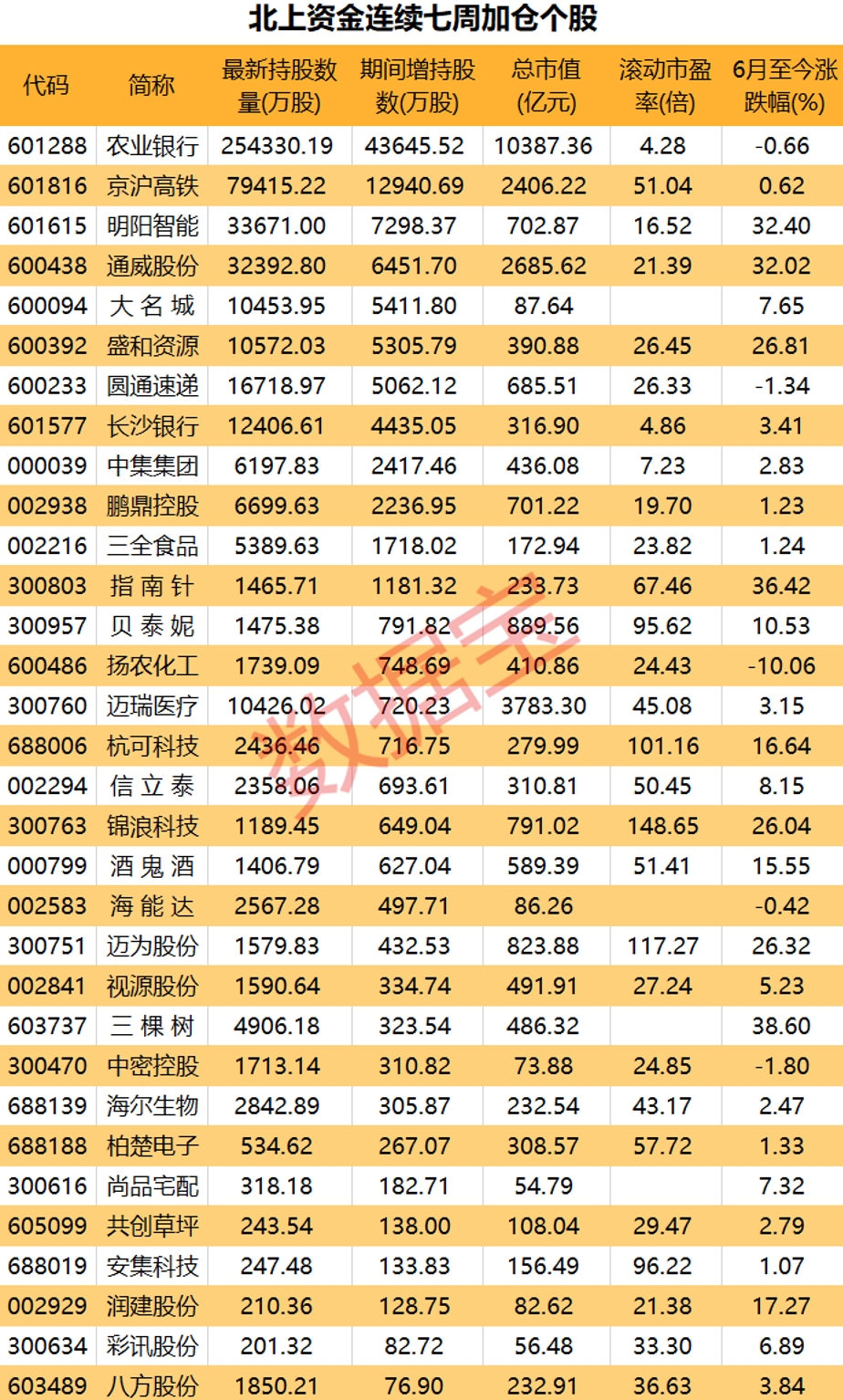 行情方面,6月至今北向资金连续加仓股普遍表现良好,32股平均上涨10.11%,大幅跑赢同期大盘。三棵树、指南针、明阳智能、通威股份等4股涨逾30%;仅扬农化工一股回撤幅度较大,超过10%。