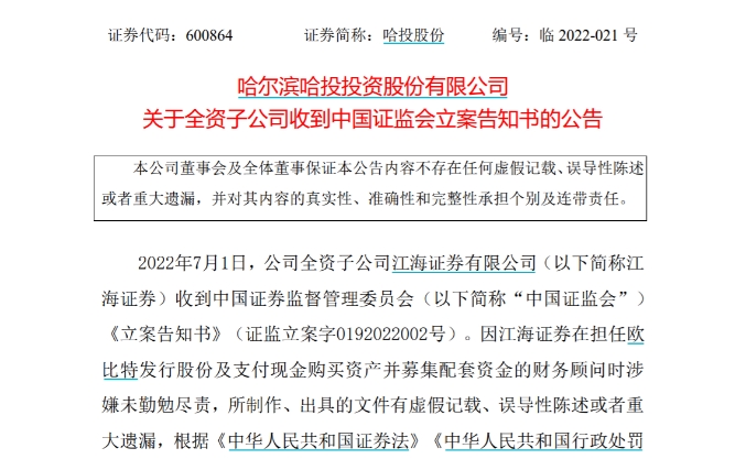 2022年7月1日,哈投股份全资子公司江海证券收到中国证监会《立案告知书》。因江海证券在担任欧比特发行股份及支付现金购买资产并募集配套资金的财务顾问时涉嫌未勤勉尽责,所制作、出具的文件有虚假记载、误导性陈述或者重大遗漏,根据《中华人民共和国证券法》《中华人民共和国行政处罚法》等法律法规,中国证监会决定对江海证券立案。