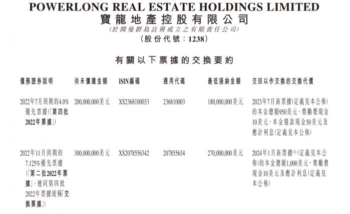 交换要约后,宝龙地产将发行两笔新票据,其中一笔到期日为2023年7月,按年利率4%计息;另一笔于2024年1月到期,按年利率7.125%计息。