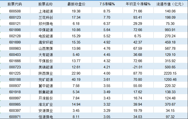 煤炭概念股(choice,7.5收盘数据)