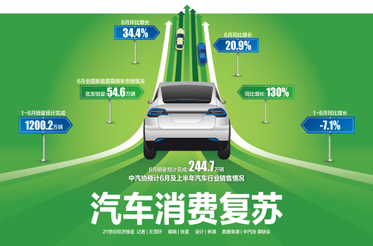 7月6日,中汽协发布数据显示,6月汽车行业销量预计完成244.7万辆,环比增长34.4%,同比增长20.9%;1-6月,销量预计完成1200.2万辆,同比下降7.1%。