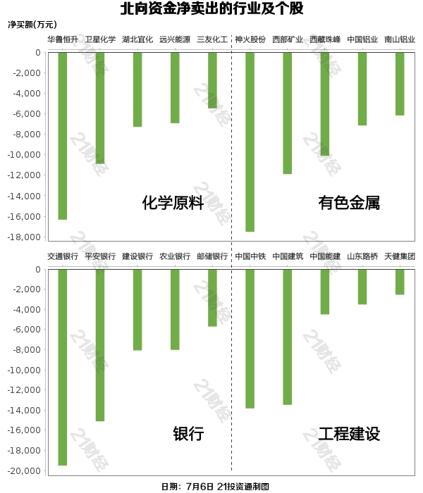 北向资金减持了70个行业,其中化学原料最多,净卖出金额达7.94亿元,其次是有色金属行业,净卖出7.35亿元。