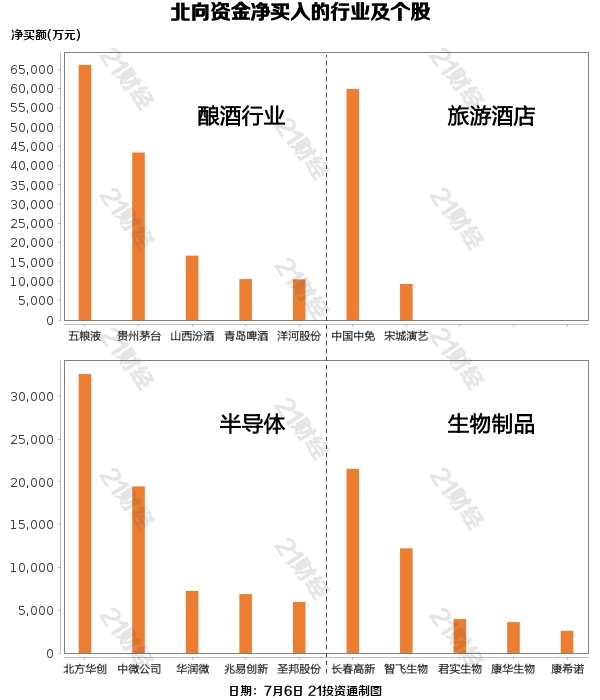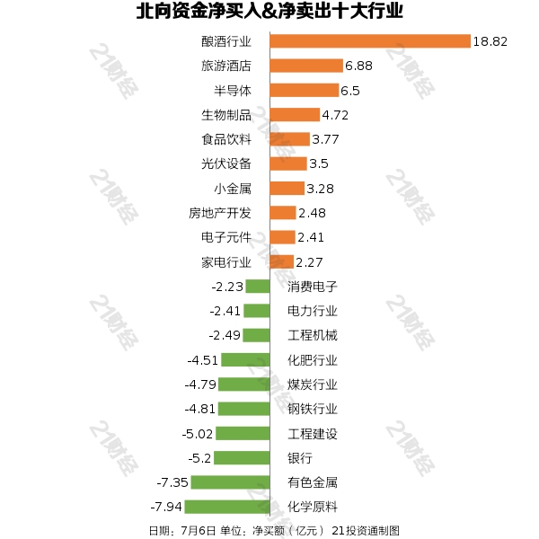 从净买入金额来看,北向资金增持了30个行业,其中酿酒行业居首,净买入金额达18.82亿元,其次是旅游酒店行业,净买入6.88亿元。