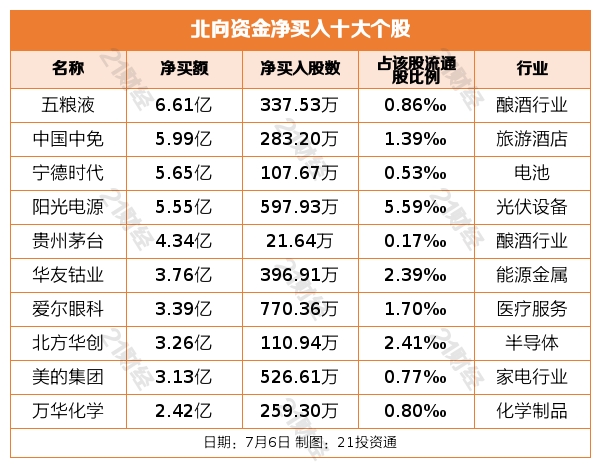 个股方面,北向资金净买入五粮液(000858.SZ)、中国中免(601888.SH)、宁德时代(300750.SZ)、阳光电源(300274.SZ)、贵州茅台(600519.SH)居前,其中,五粮液被净买入6.61亿元,中国中免被净买入5.99亿元,宁德时代被净买入5.65亿元,阳光电源被净买入5.55亿元,贵州茅台被净买入4.34亿元。