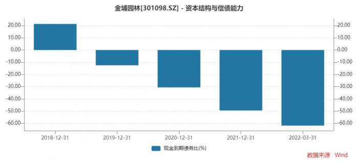 Wind数据显示,截至今年一季度末,金埔园林的“现金到期债务比”是-61.80%,而2021年底这一数据为-49.46%。