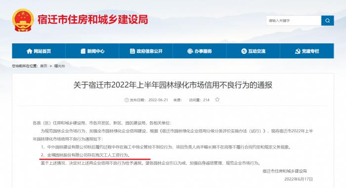 近日,宿迁市住房和城乡建设局对外披露了《关于宿迁市2022年上半年园林绿化市场信用不良行为的通报》:为规范园林企业市场行为,加强全市园林绿化企业信用建设,根据《宿迁市园林绿化企业信用分级分类评价实施办法(试行)》,现将宿迁市2022年上半年园林绿化市场信用不良行为通报,其中就包括“金埔园林股份有限公司存在拖欠工人工资行为”。