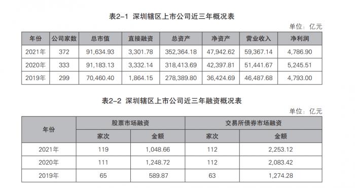 2021年末,深圳辖区上市公司资产总额352364.18亿元,同比增长10.66%;归属于上市公司股东的净资产47942.62亿元,同比增长13.08%;全年所有上市公司实现营业收入59367.14亿元,同比增长 15.41%;归属于上市公司股东的净利润4786.9亿元,同比下降8.74%。