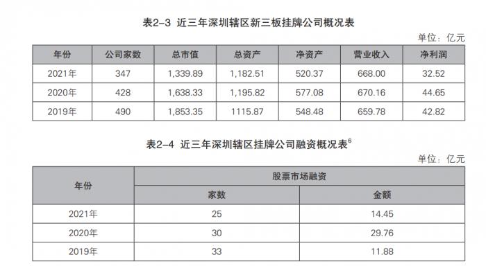 截至2021年底,深圳辖区新三板挂牌公司总股本193.75亿股,总市值1,339.89亿元。股票全年累计成交金额59.05亿元,其中采用集合竞价转让股票方式的累计成交金额为29.2亿元,采用做市转让股票方式的累计成交金额为29.85亿元。25家新三板挂牌公司共实施股票定向发行28次,总发行股数2.45亿股,融资金额14.45亿元。