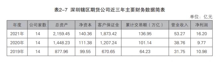 2021年,深圳辖区期货公司累计实现营业收入53.27亿元,较2020年增加37.44%;实现净利润16.20亿元,较2020年增长65.81%。