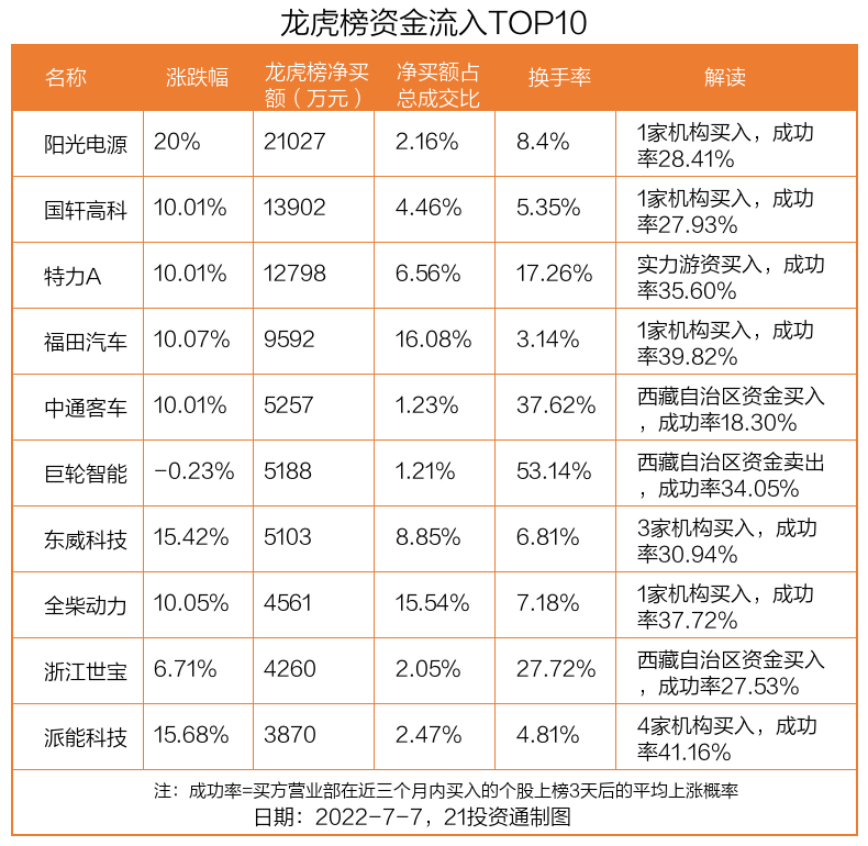 7月7日,上证指数上涨0.27%,深证成指上涨0.97%,创业板指上涨1.68%。盘后龙虎榜数据显示,共有41只个股因当日异动登上龙虎榜,资金净流入最多的是阳光电源(300274.SZ),达2.1亿元。