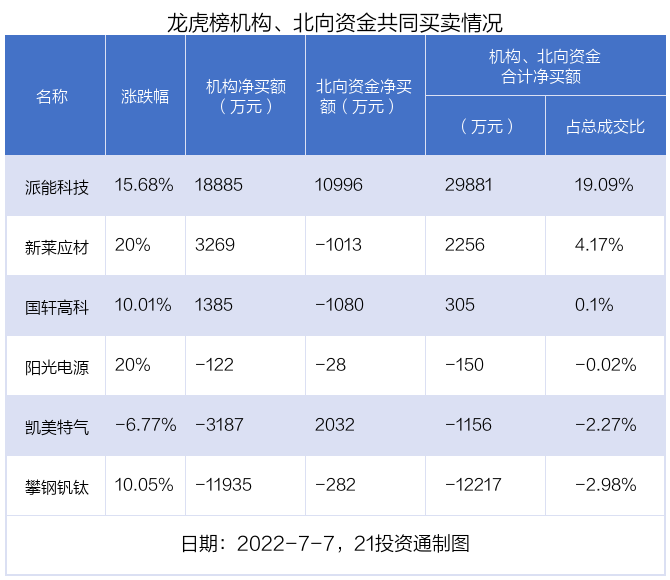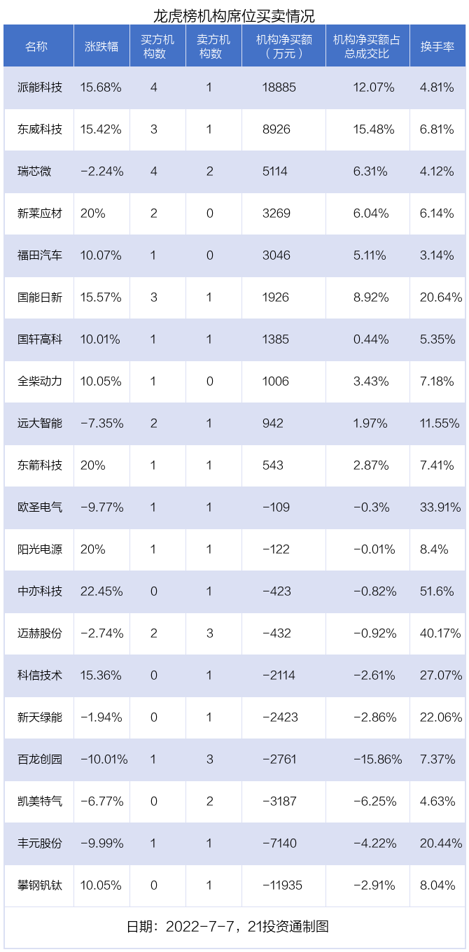 其中,机构净买入金额最多的是派能科技(688063.SH),当日收盘上涨15.68%,换手率为4.81%。前五大买卖营业部中有5家机构,为合计净买入18885万元,占总成交金额的12.07%。