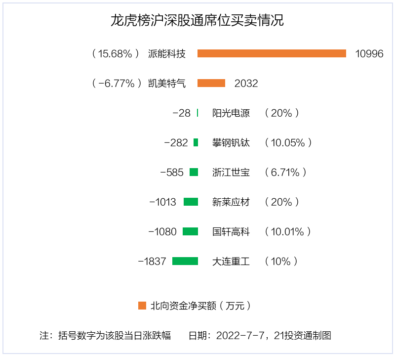 7月7日,北向资金参与龙虎榜中的个股共有8只,合计净买入8202.84万元。其中沪股通净买入1 股,净买入1.1亿元;深股通净买入1 股,净卖出6 股,合计净卖出2793.4万元。