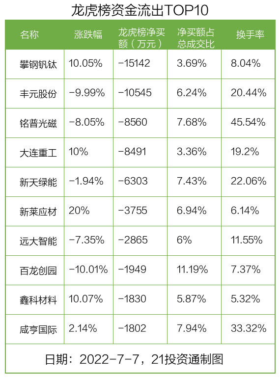 而龙虎榜中资金净流出最多的是攀钢钒钛(000629.SZ),被净卖出为1.51亿元,占总成交金额的3.69%。攀钢钒钛收盘上涨10.05%,换手率为8.04%。