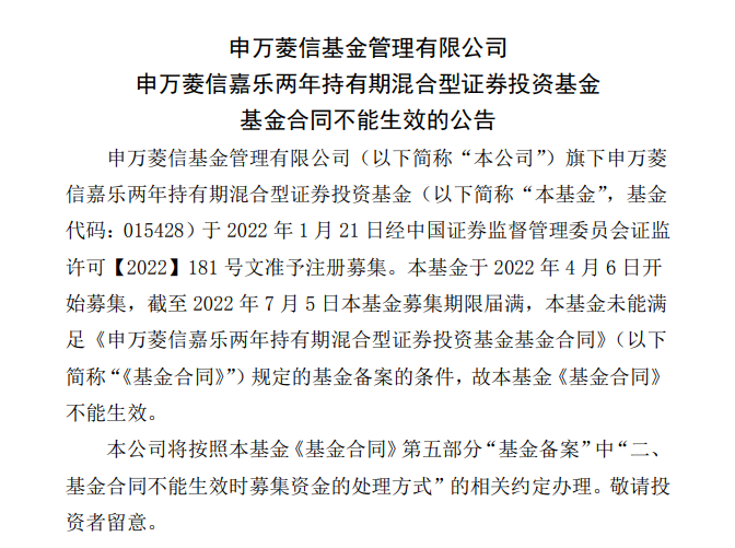 7月6日,申万菱信基金发布公告称,旗下申万菱信嘉乐两年持有期混合型基金截至2022年7月5日基金募集期限届满,未能满足《基金合同》约定的基金备案条件,故《基金合同》不能生效。