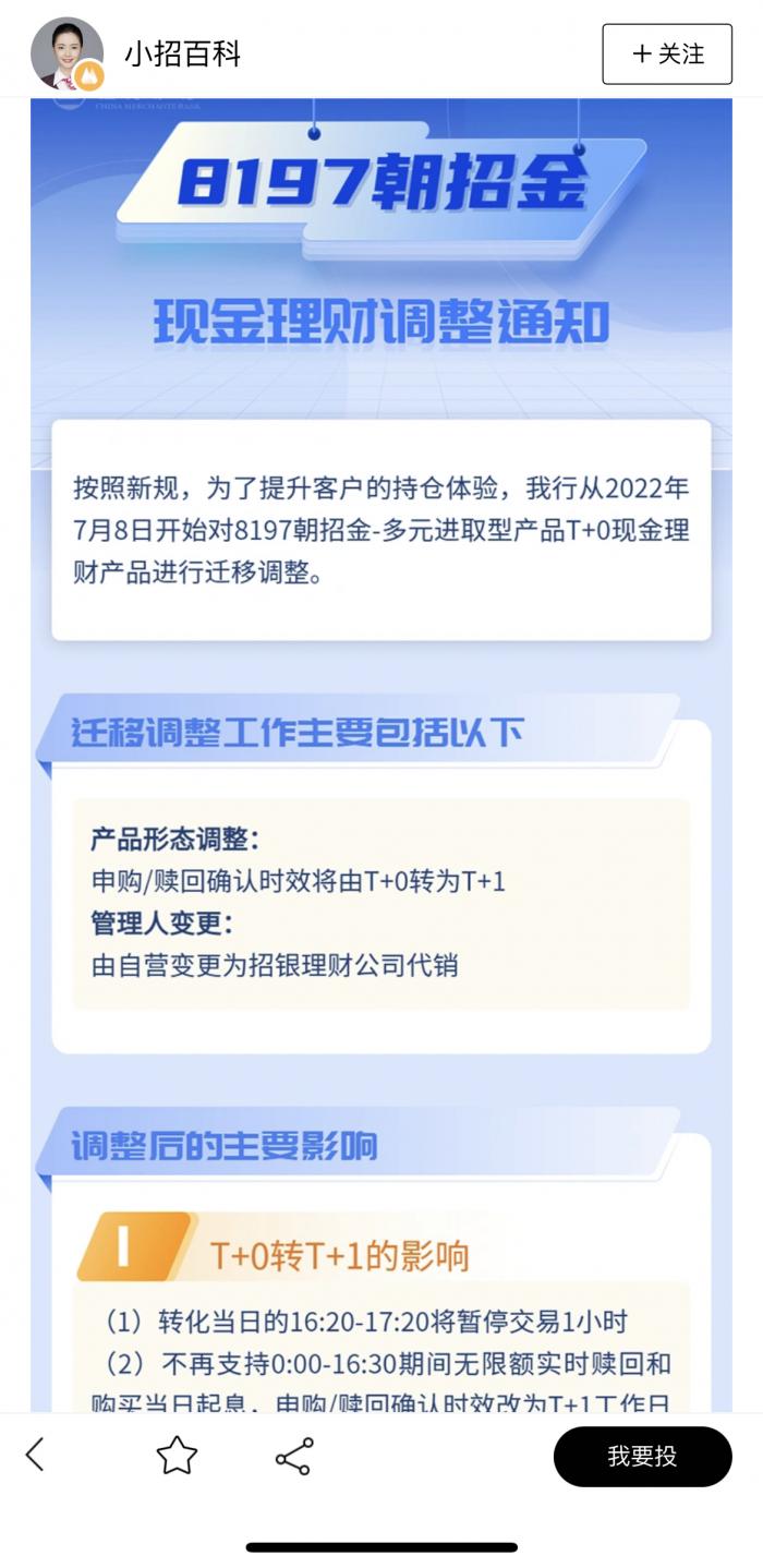他所说的理财产品,是招商银行现金管理类产品中的拳头产品“朝招金”。21世纪经济报道记者查询招商银行APP,发现了一则发布于2022年6月27日的“朝招金(多元进取型)理财计划调整理财计划合同公告”。该公告显示,7月8日之后申购赎回条款进行变更,调整后申购/赎回确认日由T日和T+1日变更为T+1和T+2日。