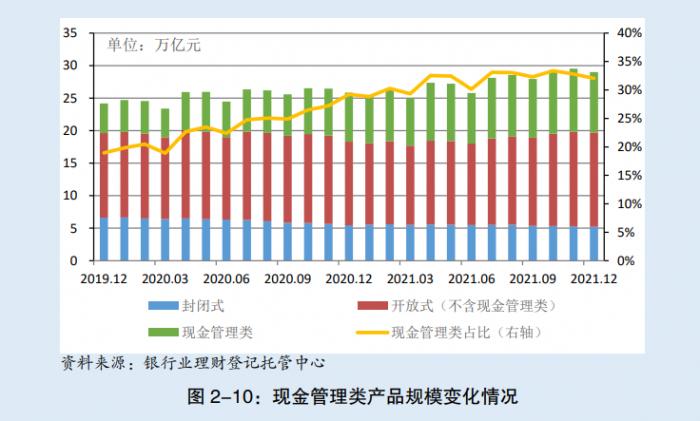 根据银行业理财登记托管中心数据显示,截至2021年底,全市场存续有现金管理类理财产品316只,存续余额达到9.29万亿元,同比增长22.89%,增速较上年同期减少41.95个百分点;2021年,现金管理类理财产品累计募集金额达到67.95万亿元,占全部理财产品募集金额的55.61%。
