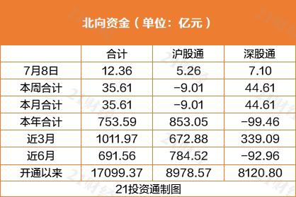 据21投资通(微信号ID:touzit21)智能监测,北向资金全天净买入12.36亿元,其中沪股通净买入5.26亿元,深股通净买入7.10亿元。
