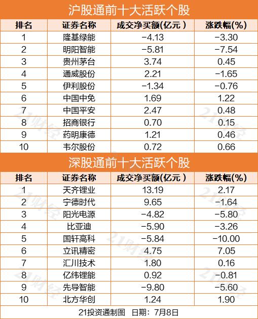 十大活跃个股方面,天齐锂业(002466.SZ)、宁德时代(300750.SZ)、立讯精密(002475.SZ)获净买入居前,金额分别为13.19亿元、9.65亿元、4.75亿元