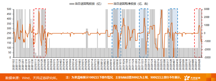 央行常规逆回购操作以100亿规模居多:从过去经验来看,季度初回笼资金时,央行大多选择100亿规模的常规操作,则前期投放量到期后自然形成季度初的净回笼(如图中蓝框部分)。