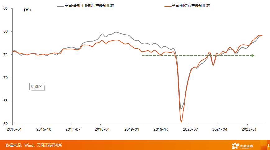 20年疫情后,美国产能利用率底部回升;22年疫情前后,产能高位
