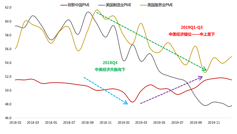 但是2019年Q1,中国PMI和中长期贷款增速回升,即便美国经济继续快速向下,A股受影响就比较有限了。
