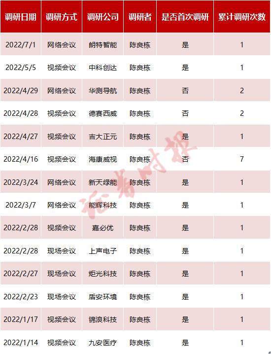在今年市场调整过程中,陈良栋并没有因此停止调研的脚步,今年来已多次出现在上市公司调研名单中。