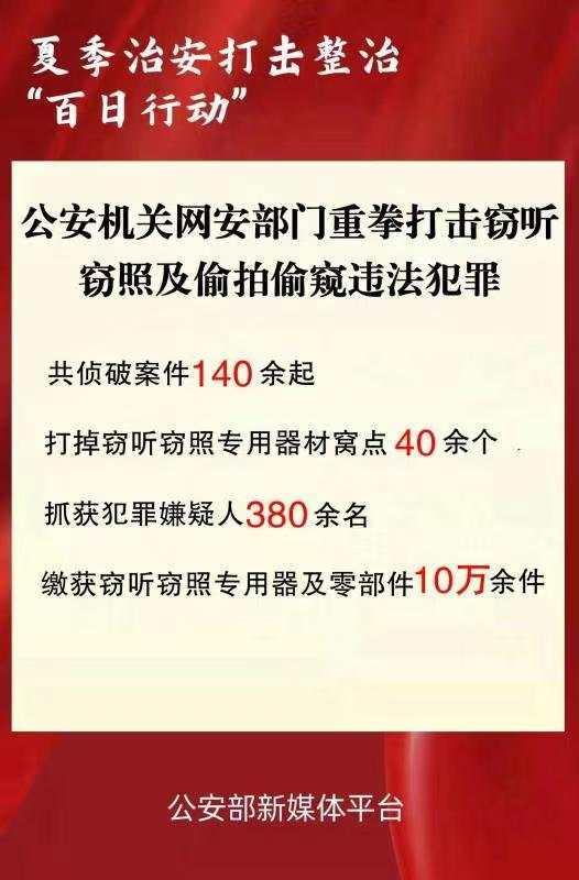 全国公安机关网安部门认真贯彻公安部党委决策部署,紧密结合夏季治安打击整治“百日行动”,深入推进打击非法生产、销售、使用窃听窃照专用器材“断源”行动和打击偷拍偷窥“扫雷”行动,依法严打非法生产、安装、控制网络摄像头等窃听窃照器材及偷拍偷窥违法犯罪,切实维护良好社会秩序,不断增强人民群众安全感。截至目前,共侦破案件140余起,打掉非法生产窃听窃照专用器材窝点40余个,抓获犯罪嫌疑人380余名,缴获窃听窃照专用器材及零部件10万余件。